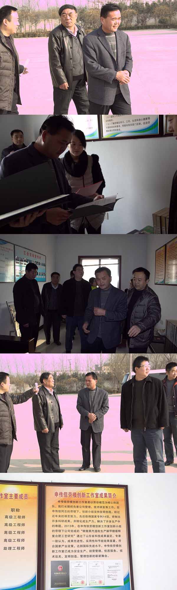 菏泽市市工会领导23日上午到我公司考察指导工作,工会领导首先参观了我公司厂区、车间以及员工办公室、宿舍、食堂等场所,市工会对我公司员工工作环境做了充分的肯定,对公司大力投入硬件设施改善员工待遇水平工作做了表扬,关切我们要始终做好职工职业健康工作;之后听取了我公司李总关于“申传信劳模工作室”的工作汇报。“申传信劳模工作室”是以劳动模范为核心的团队,是在县政府支持鼓励下建立的,组建团队的目的是为了解决肥料生产中遇到的技术难题和研发新的产品。工作室坚持发明创造,自主创新。经过近年来的艰苦努力及齐心协力,公司先后获得国家专利14项,研制出许多科研成果,并转化成生产力,解决了许多生产中的难题。2014年11月创新工作室的新成果“20万吨硝硫基”高塔试车成功,所产硝硫基产品颗粒均匀,色泽圆润,硬度、水分皆达到国家标准。创新小组不断克服技术困难反复调试,引进国内先进技术同时不断自我创新,使硝硫基生产技术水平达到了国内领先水平。 申传信劳模创新工作室已成为安全生产、经营管理、优质服务、技术攻关、发明创造、管理创新的崭新舞台。“申传信劳模工作室”已成为全县劳模工作室的典范。